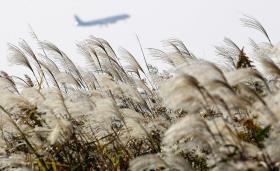 부산 사상구 삼락생태공원 갈대밭 위로 날아가는 민항기