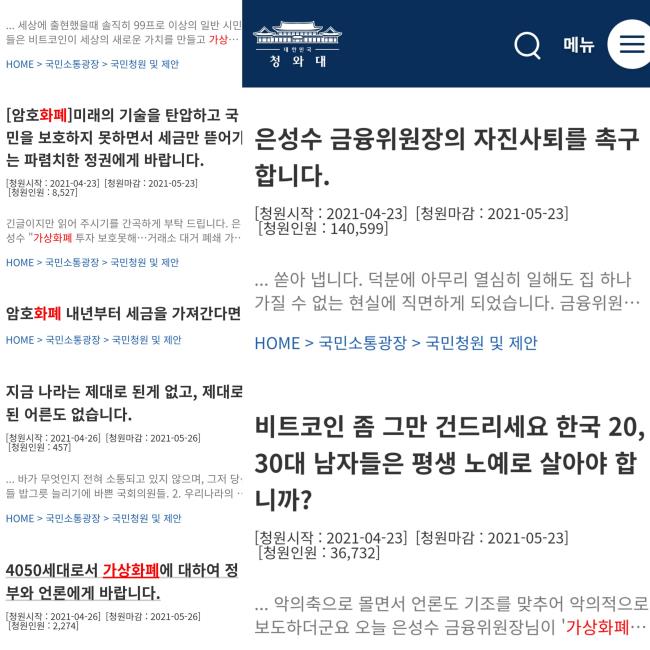 최근 논란이 되고 있는 정부의 '가상화폐 투자 이익 징세' 이슈와 관련, 청와대 국민청원 게시판에 다양한 민원 게시물이 올라오고 있다. 여론의 관심도 뜨겁다. 지난 23일 올라온 '은성수 금융위원장의 자진 사퇴 촉구' 청원글은 현재까지 14만 명의 동의를 받은 상태고, '암호화폐 수익 공제금 증액 및 과세 적용 시기 연기 요청' 청원글은 5만 명에 육박하는 동의를 받았다.