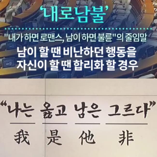 《시사상식사전》에 등재된 '내로남불'의 뜻은 다음과 같다. "사자성어라고 오해할 수 있는 이 단어는 1990년대 정치권에서 만들어져 오프라인과 온라인 등 일상에서 활발히 쓰이고 있는 말로, ‘내가 하면 로맨스 남이 하면 불륜’을 줄여 말하는 것이다. 이는 똑같은 상황에 처했을 때 자신과 타인을 다른 시선으로 바라보는 이중 잣대를 가진 사람을 나타내는 말이다. 즉, 남은 비난하지만 자신에게는 너그러운 사람을 일컫는다. 한편, 내로남불과 비슷한 의미를 가진 사자성어에는 ‘나는 옳고 다른 이는 그르다’라는 뜻을 가진 ‘我是他非(아시타비)’가 있다."