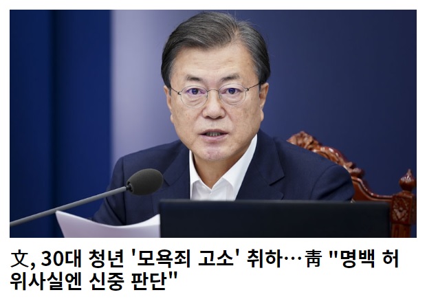 문재인 대통령이 정권 비판 전단을 돌린 30대 청년에 대해 ‘모욕죄 고소’를 취하했다. 모욕죄는 친고죄(親告罪)로서 당사자나 법률대리인이 직접 고소해야 공소(公訴) 제기가 가능하다. 해당 청년이 돌린 전단에는 ‘북조선의 개, 한국 대통령 문재인의 새빨간 정체’라는 문구가 적힌 일본 잡지의 한 페이지가 인쇄돼 있던 것으로 전해졌다.