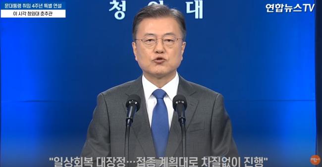 문재인 대통령이 10일 청와대 춘추관 대브리핑룸에서 취임 4주년 특별연설을 했다. 문 대통령은 이날 연설의 대부분을 코로나19 사태와 관련, 방역 현황과 백신 접종 등 제반 문제를 거론하는 데 썼다.