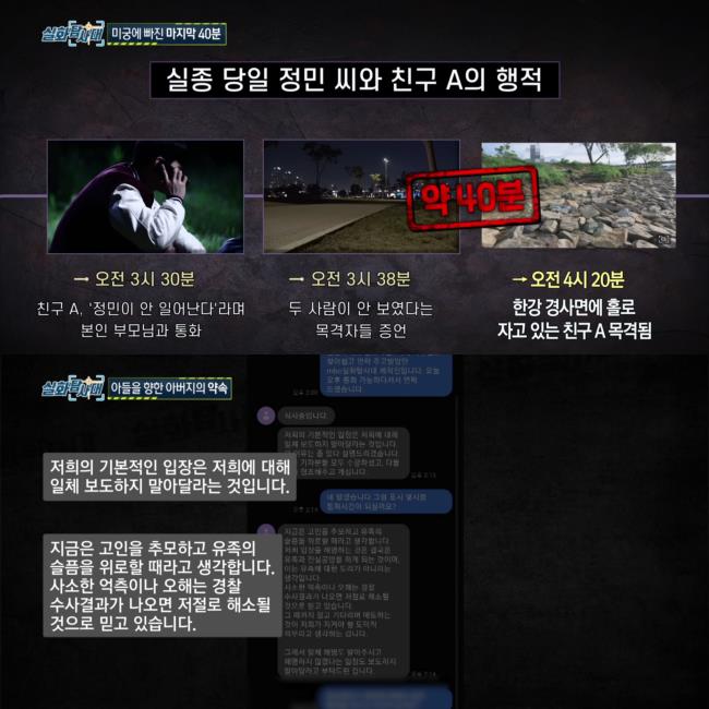 지난달 25일 반포한강공원에서 실종된 뒤 숨진 채 발견된 고(故) 손정민군의 친구 A씨의 입장이 최초로 공개됐다. 사건 당일 A씨는 손군과 함께 있던 유일한 사람으로, 손군이 실종된 시간대의 행적에 대한 경찰 조사가 진행되고 있다.