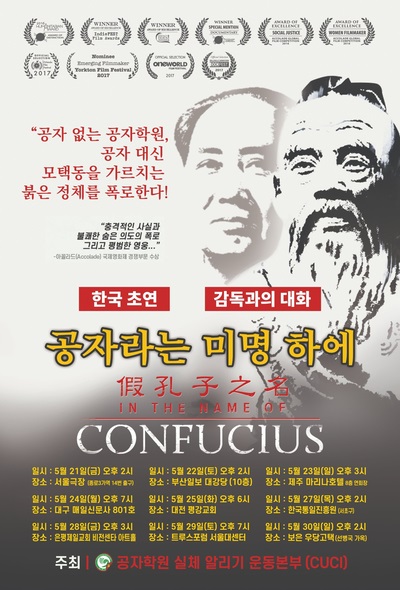 중국공산당의 선전 기관이란 의혹을 받는 '공자학원'(孔子學院)을 소재로 만든 영화가 한국에서 초연된다. 도리스 리우(Doris Liu) 감독의 다큐 영화 '공자라는 미명 하에'(In the Name of Confucius).