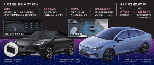 라이다 기술을 선도해왔던 건 루미나·벨로다인·웨이모 등 미국 기업들이다. 하지만 올해를 기점으로 화웨이·DJI·바이두 등 중국 기업들이 라이다 제품을 양산하면서 존재감을 높이고 있다. 올해 2억3000만위안(약 405억원) 규모인 중국 라이다 시장이 2026년이 되면 431억8000만위안(약 7조6000억원)으로 급성장할 것이라고 중국 치엔잔산업연구원은 전망했다.
