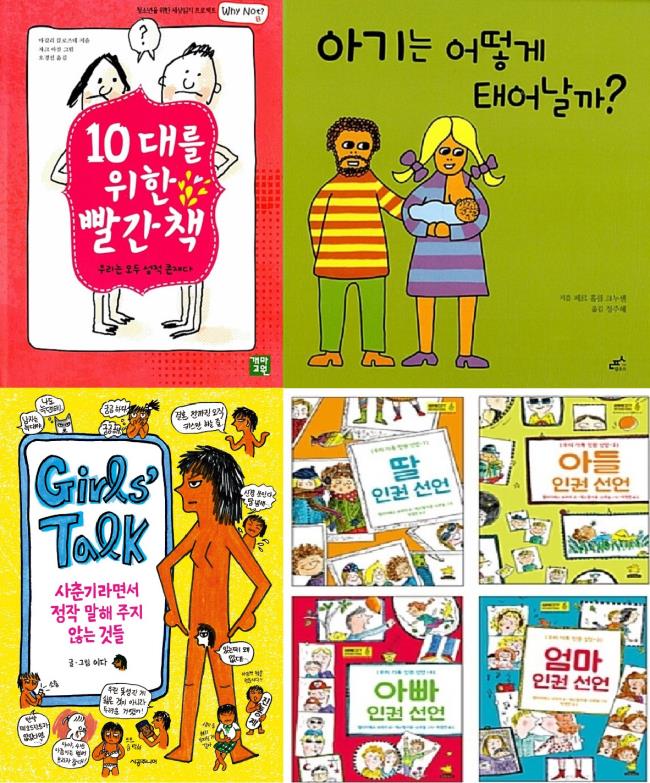 논란이 됐던 도서는 '10대를 위한 빨간 책'(마갈리 클로즈네르 著), '아기는 어떻게 태어날까?'(페르 홀름 크누센 著), '걸스 토크'(이다 著), '우리 가족 인권 선언'(엘리자베스 브라미 著) 등이다. '우리 가족 인권 선언'은 '아빠 인권 선언', '엄마 인권 선언', '아들 인권 선언', '딸 인권 선언' 총 4권으로 구성돼 있다.
