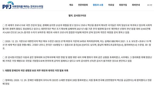 정교모는 또 “백신 도입 지연 배후에 국내 백신 치료제 생산 기업을 비호(庇護)하기 위한 청와대 관계자가 있었다는 의혹”과 “관련 공무원들의 직무유기, 숱한 말 바꾸기로 국민을 속인 행위”에 대한 신속한 감사 착수를 촉구했다.