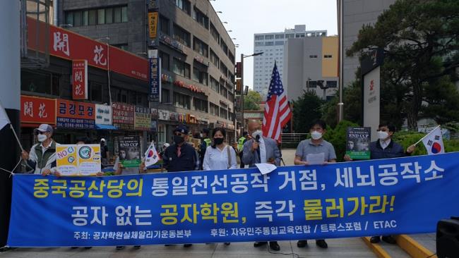 이날 기자회견을 주최한 공자학원 실체알리기 운동본부(이하 공실본)는 공자학원을 "중국공산당이 통일전선공작을 펼치는 거점, '공자'라는 가면을 쓰고 '중국어와 중국문화'라는 미끼를 내걸고 젊은이들을 공산주의로 물들이는 악마적인 세뇌공작소"로 규정하고, 즉각 철수할 것을 요구했다.