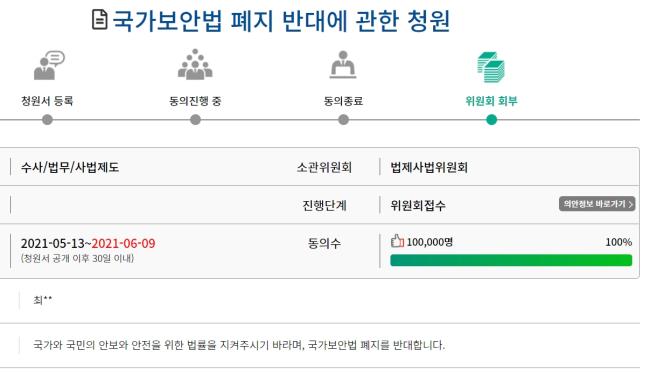 9일 '국가보안법 폐지 반대' 국회 청원 동의가 10만 명을 돌파해 소관 상임위원회인 법제사법위원회에 회부될 예정이다.