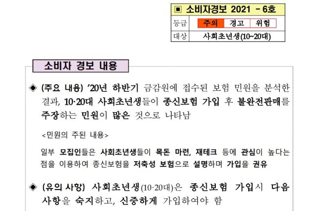 금감원은 “종신보험은 본인(피보험자) 사망 시 유족에게 경제적 도움을 주기 위한 보장성 보험임에도 불구하고, 일부 모집인들이 10·20대 사회초년생을 대상으로 종신보험을 보장성 보험이 아닌 저축성 보험으로 설명하여 가입을 유도한다는 민원이 많아 소비자 경보를 발령한다”고 밝혔다. 이어 “종신보험은 저축성 보험과 비교하여 보다 많은 위험 보험료(사망 등 보장) 및 사업비(모집인 수수료 등)가 납입 보험료에서 공제되므로 저축 목적으로는 적합하지 않다”고 덧붙였다.
