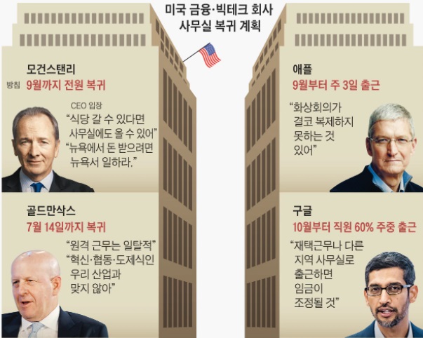 백신 접종 속도전으로 코로나19 확산세가 완화(緩和)되고 있는 미국의 글로벌 금융사·빅테크 최고경영자(CEO)들이 재택근무 중인 직원들의 ‘사무실 복귀’를 명령해 눈길이 쏠린다.