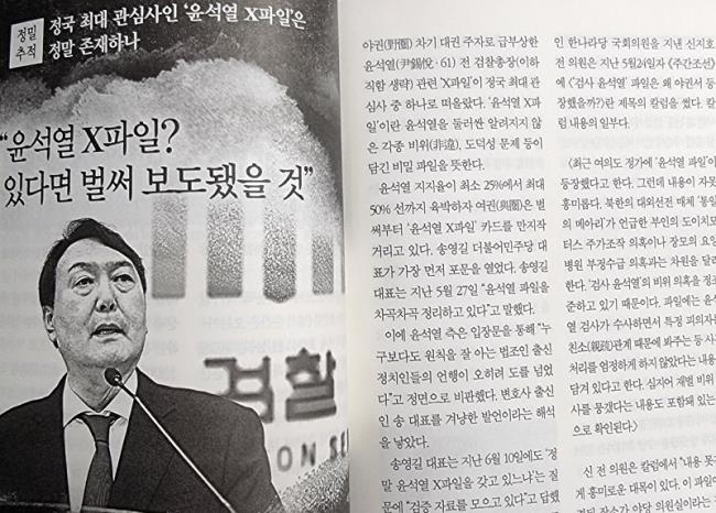 앞서 조 기자는 월간조선 7월호에서 윤석열X파일 실체를 추적보도했다. 해당 기사의 제목은 "윤석열 X파일? 있다면 벌써 보도됐을 것"이다.