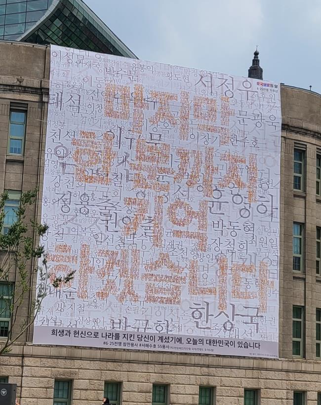 호국 보훈의 달과 6.25전쟁 71주년을 맞아 서울시는 24일 서울도서관 외벽에 '마지막 한분까지 기억하겠습니다'라는 메시지가 담긴 대형 현수막을 내걸어 6.25참전용사와 서해수호 용사들을 추모하고 있다.