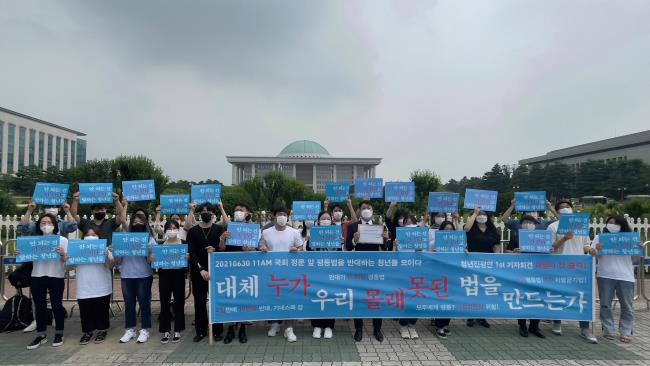 이날 기자회견은 평등법·차별금지법 제정을 막기 위해 결성된 '청년진평연'(진정한 평등을 바라며 나쁜 차별금지법을 반대하는 청년연합)이 주최했다. 청년들은 "정의당은 사회적 약자를 이용하는 '성적지향 및 성별정체성' 입법 시도를 중단하라" "더불어민주당은 비겁으로 점철된 '평등법' 입법 시도를 중단하라"고 외치며 평등법 제정을 시도하는 민주당과 정의당 의원들을 규탄했다. 국민의힘을 향해서는 "국민의힘은 국민의 힘을 받기만 할 것이라면 구걸당으로 개명하라"며 법안 저지에 소극적인 태도를 비판했다.
