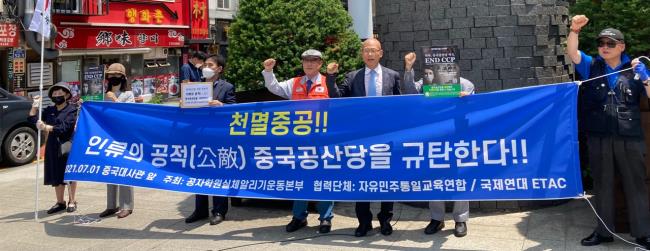 중국공산당 창당 100주년을 맞아 시민단체 공자학원실체알리기운동본부(공실본)가 1일 오전 11시 서울 명동 중국대사관 앞에서 중국공산당의 인권 침해를 규탄하는 집회를 열었다. 앞서 미국 의회와 유엔 인권이사회 전문가들 사이에서도 중국공산당을 규탄하는 목소리가 나왔다.