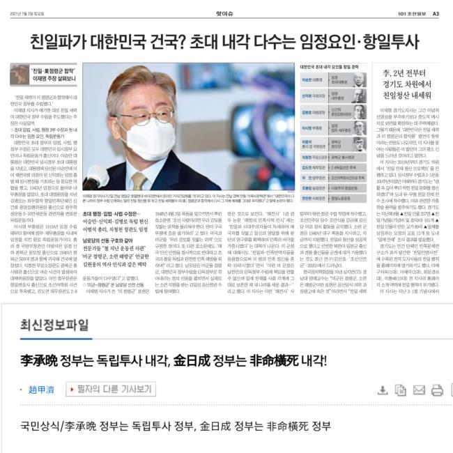 《조선일보》는 "대한민국 초대 정부의 이승만 대통령은 세계가 인정하는 반일 독립투사였다. 그의 반일은 지나칠 정도였다, 역사 책을 읽으면 곧 알 수 있다"며 "이시영 부통령은 상해 임시정부 내무총장, 이범석 총리는 광복군 참모장, 이인 법무장관은 항일 변호사, 조봉암 농림장관은 좌파 독립운동가였다. 초대 내각 대부분이 항일 인사로 채워졌다"고 지적했다. 이어 "반면 북한은 소련에 협력하면 친일파를 장관에 기용했고 반대하면 조만식과 같은 항일 독립운동가도 숙청했다"고 덧붙였다.