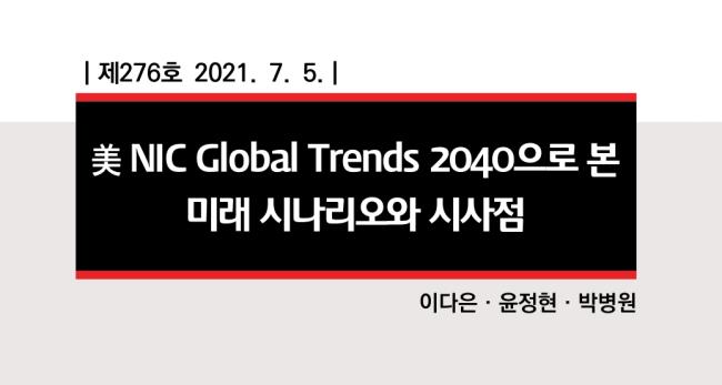미국 국가정보위원회(NIC·National Intelligence Council)가 지난 3월 발표한 미래 보고서 '글로벌 트렌드 2040: 더 경쟁적인 세계(Global Trends 2040: A More Contested World)'를 분석하고 한국에의 시사점을 담은 국내 연구자료가 나왔다.