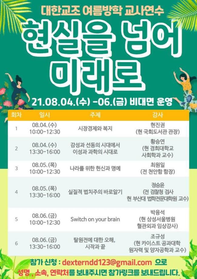 대한민국교원조합(대한교조)과 올바른교육을위한전국교사연합(올교련)이 공동주최하는 여름방학 교사연수가 8월 4일부터 6일까지 비대면 진행된다.