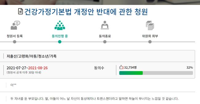 지난 27일 국회 국민동의청원 홈페이지에 '건강가정기본법 개정안 반대 청원'이 올라온 가운데 청원 3일째인 오늘(29일) 오전 9시 30분 기준 3만2000여 명이 동의했다.