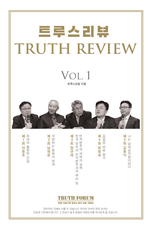 《트루스리뷰 Vol. 1》은 2017년 서울대에서 진행된 트루스포럼 1~5회 강연을 정리한 책이다. 이동호 전 여의도연구원 부원장, 남재준 전 국정원장, 정규재 전 펜앤드마이크 대표, 최영재 더자유일보 대표, 남파공작원 출신 김동식 박사의 강연을 차례로 담았다.