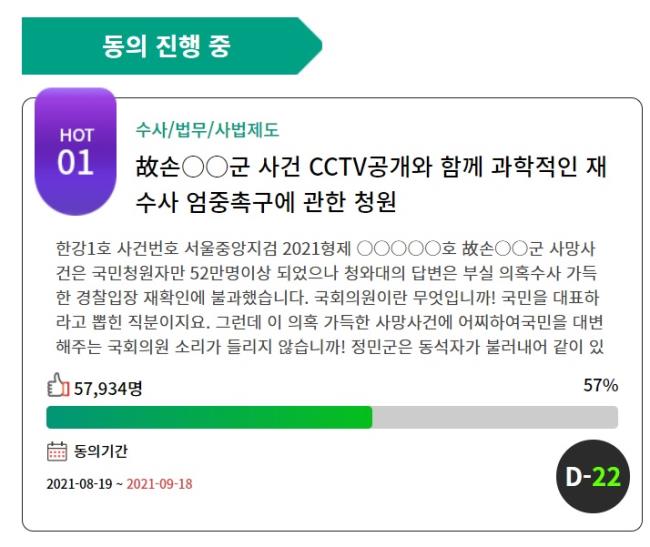‘故 손○○군 사건 CCTV 공개와 함께 과학적인 재수사 엄중 촉구에 관한 청원’이라는 제하의 청원글은 지난 19일 국회 국민동의청원 게시판에 올라왔다. 이 글은 27일 오후 5시 30분 기준 총 5만7934명의 동의를 받았다. 국회 청원은 청원서 공개 이후 30일 이내 10만 명 이상 동의를 받을 경우, 소관 상임위원회에 정식 회부돼 입법 심사 과정을 거치게 된다.
