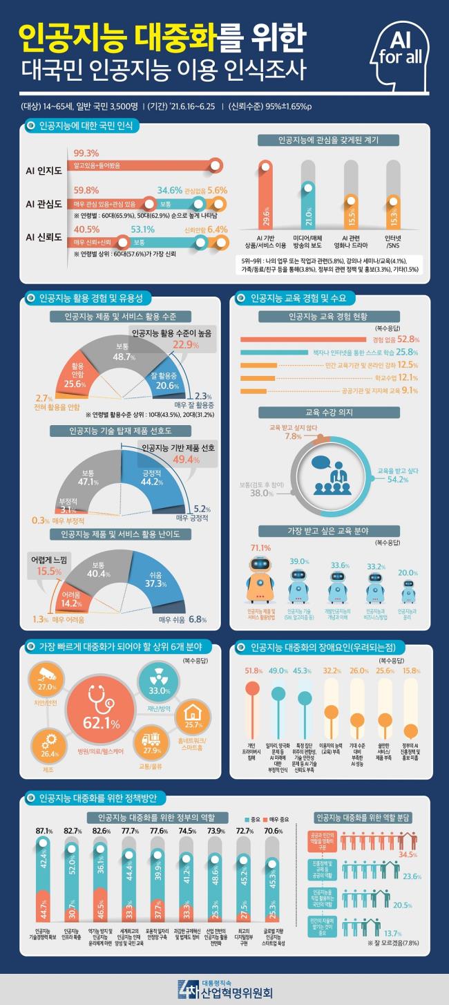대통령직속 4차산업혁명위원회(이하 4차위)는 1일 '인공지능 대중화를 위한 대국민 인공지능 이용 인식조사' 결과를 발표했다. 조사는 올해 6월 16∼25일 14∼65세 일반 국민 3500명을 대상으로 이뤄졌다.