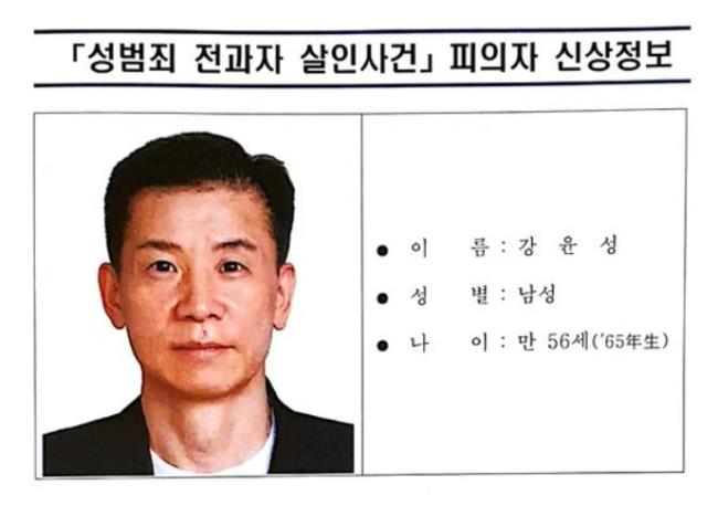 성범죄를 포함해 전과 14범인 강윤성은 1965년생으로 올해 만 56세 남성이다. 1982년 특수절도죄, 1986년 절도죄, 1989년과 1992년 특정범죄 가중처벌 등에 관한 법률상 절도죄와 1997년 강도강간·강도상해죄 등을 자행했다. 2005년 보호감호 처분을 받으며 가출소했지만, 두 달 만에 집단 강도·협박 등 범행을 저질러 다시 15년간 수감됐다. 지난 5월 출소한 강윤성은 전자발찌를 차고 생활하다 지난달 말 다시 강력 범죄를 저질렀다. 노래방에서 알게 된 40대 여성을 살해한 것. 이후 지난달 27일 전자발찌를 끊고 도주한 그는 같은 달 29일 새벽, 돈을 갚겠다며 지인인 50대 여성을 유인해 살해했고 이날 범행 발각을 우려해 자수했다.