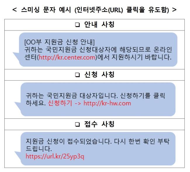 정부는 국민지원금 신청·지급이 시작되는 6일부터 각 통신사 명의로 '스미싱 피해예방 문자'를 순차 발송하는 등 다양한 창구를 활용해 스미싱에 대한 이용자의 경각심을 높이고자 하며, 24시간 모니터링을 실시하고, 신고·접수된 스미싱 정보를 분석해 악성앱 유포지를 즉시 차단하는 등 이용자의 피해를 최소화하기 위해 총력을 다한다는 방침이다.