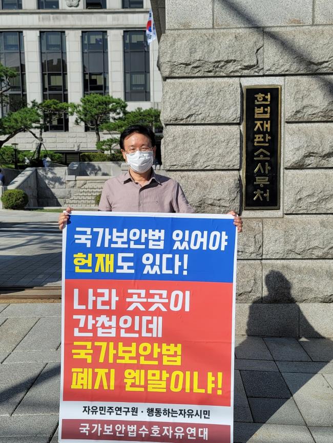 국가보안법수호자유연대(이하 자유연대)는 6일 오전 서울 종로구 헌법재판소 앞에서 국가보안법(국보법) 폐지 저지를 위한 1인 릴레이 시위를 진행했다.
