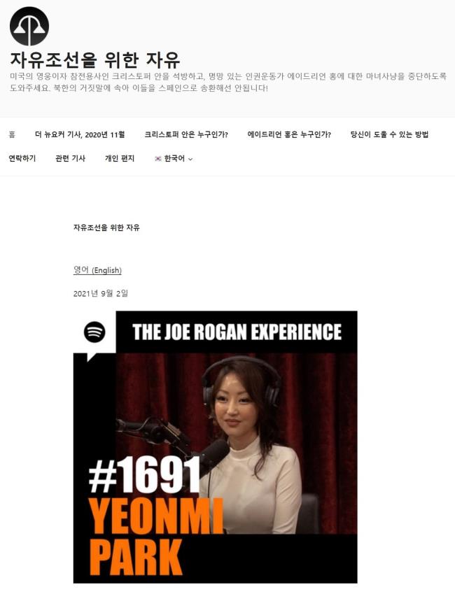 자유조선이 운영하는 '자유조선을 위한 자유' 홈페이지에는 지난 2일 탈북여성 박연미 씨와 희극배우이자 종합격투기인 UFC 해설가인 조 로건(Joe Rogan)의 대담 방송('더 조 로건 익스피리언스') 의 내용이 담긴 세계 최대 음악 방송 업체인 '스포티파이'(Spotify) 링크가 올라왔다.