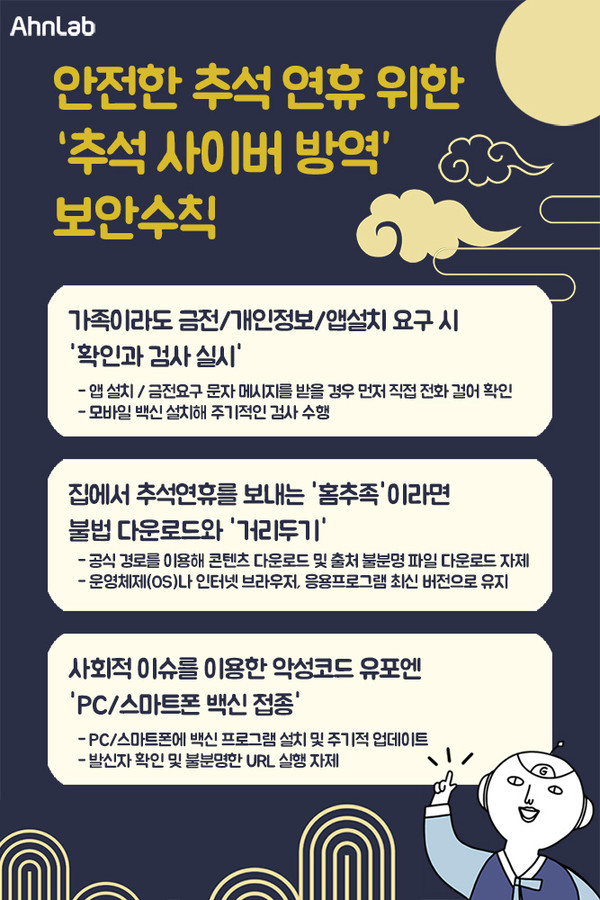 정보보안업체 '안랩'이 추석 연휴 기간을 안전하게 보내기 위한 '추석 사이버 방역' 보안 수칙을 발표했다.