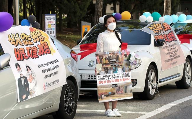결혼식을 앞둔 예비부부와 코로나 팬데믹 상황에서 결혼한 신혼부부 등이 정부의 결혼식장 방역 지침 개선을 요구하며 15일 '웨딩카 주차 시위'를 벌였다.