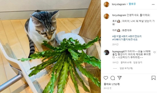 윤 전 총장의 애완견 '토리'를 주인공으로 한 인스타그램에는 지난 1일 집 안에서 애완묘 '나비'가 넘어진 화분을 쳐다보는 사진 한 장이 올라왔다.