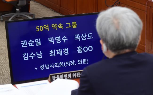박 의원은 이날 국회 국감장에서 “(천화동인 5호 소유주 정영학 회계사) 녹취록에 50억 약속 그룹으로 언급된 분들”이라며 “권순일, 박영수, 곽상도, 김수남, 최재경, 홍모씨”라고 발언했다. 현직 의원부터 전직 대법관·특별검사·검찰총장에 청와대 민정수석 등 주로 고위 법조계 인사들이었다. 이중 실명이 공개되지 않은 홍모씨는 모 언론사 관계자라는 추측이 나오고 있다. 명단에 언급된 몇몇 인사들은 ‘사실무근’이라며 법적 조치를 예고하기도 했다.