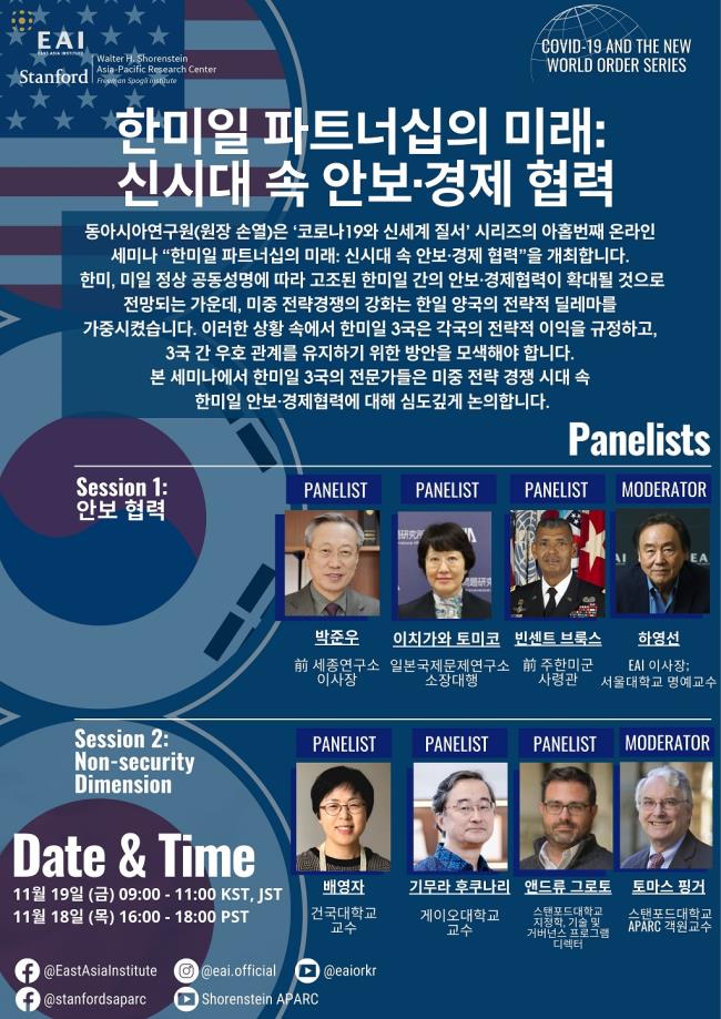 동아시아연구원(EAI)이 오는 19일 오전 9시 '코로나19와 신세계 질서' 시리즈의 아홉번째 온라인 세미나 '한미일 파트너십의 미래: 신시대 속 안보·경제 협력'을 개최한다.
