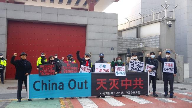 시민단체 차이나 아웃(China Out!), 나라지킴이고교연합, 자유수호포럼은 지난 8일 오전 11시 30분 서울 명동 중국대사관 앞에서 기자회견을 열고 "자유와 인권을 존중하는 전 세계 모든 인류와 함께 대한민국 시민들은 미국 정부의 결정을 열렬히 환영한다"며 "중국 공산당이 올림픽을 개최한다는 것은 올림픽 정신에 대한 모욕이며 인류에 대한 도전"이라고 밝혔다.