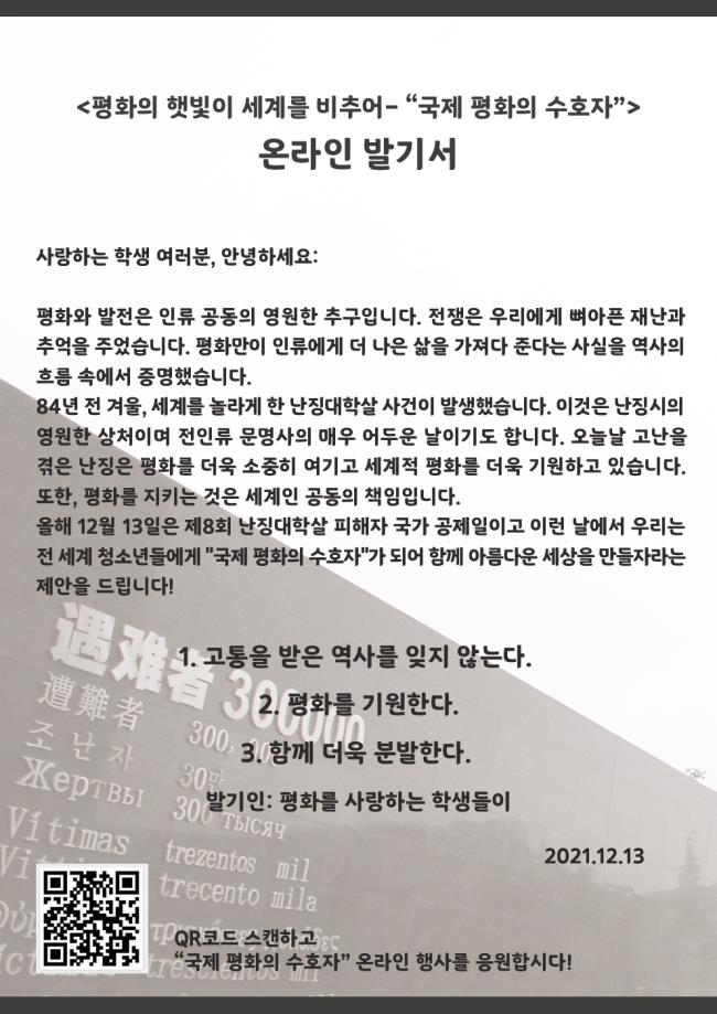 청소년들은 “고통받은 역사를 명심하고 랜선으로 평화 기원”이라는 주제의 행사를 통해, 전 세계에 ‘평화의 햇빛이 세계를 비추다 – 세계 평화의 수호자’라는 제하의 발기서를 온라인에 공개했다. 발표 행사는 난징대학살 추모관에서 열렸다.