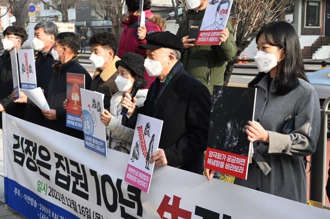 김정일 사망, 김정은 집권 10년을 하루 앞둔 지난 16일 오전 11시 서울 종로 옥인교회 앞에서 북한정권을 규탄하는 기자회견이 열렸다.