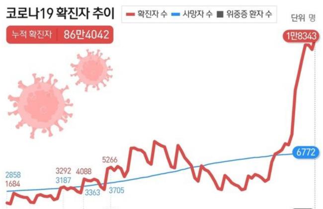 국내 지역발생은 1만8123명, 해외유입은 220명으로 나타났다. 누적 확진자는 86만4042명이다. 국내발생 주간일평균 확진자는 1만6075.1명이 됐다.
