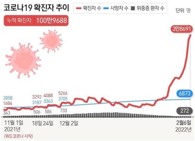 전파력이 강한 오미크론 변이의 확산으로 지난 1일(0시 기준)부터 6일째 역대 최다 기록을 경신했다. 특히 국내 누적 확진자는 이날 100만9688명을 기록, 100만 명대를 넘어섰다.