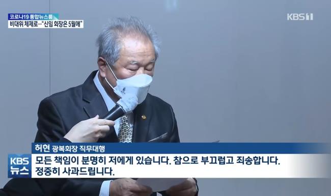 이런 가운데 허 대행은 임시총회 개의 전 "이유 여하를 불문하고 모든 책임은 분명히 우리(집행부)에게 있어 부끄럽고 죄송하다. 오늘 나올 의견을 적극 수렴해 광복회를 쇄신하겠다"며 큰 절을 올렸으나 일부 회원들은 "쇼 하지 말라"라고 외치며 야유를 보냈다.