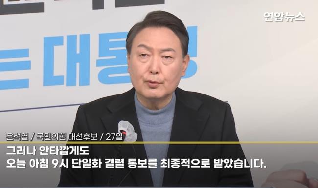 윤석열 국민의힘 대선후보가 27일 서울 여의도 당사(黨舍)에서 긴급 기자회견을 열고 안철수 국민의당 대선후보와의 야권 단일화 결렬 소식을 전하며 그간의 협상 과정에 대해 자세하게 밝혔다.