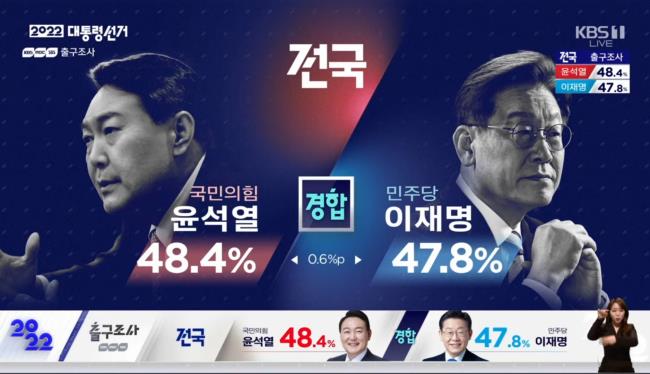 9일 제20대 대선 지상파 3사 출구조사 발표 결과 이재명 더불어민주당 대선후보가 47.8%, 윤석열 국민의힘 대선후보가 48.4% 득표율을 얻을 것으로 예상됐다.