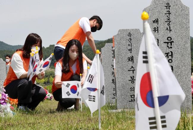 대전 유성구 국립대전현충원 묘역에서 한화그룹 충청지역봉사단이 '호국보훈의 달'을 추념해 순국선열의 숭고한 정신을 기리며 태극기 교체 작업 등 봉사활동을 하고 있다. 사진=조선일보