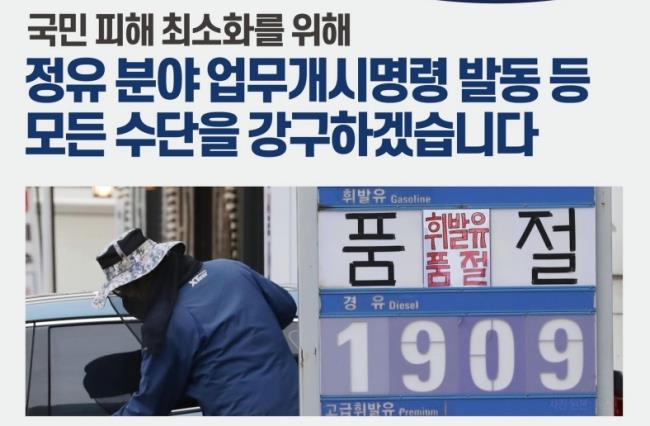 이 장관은 또 “수도권을 중심으로 한 주유소의 재고 문제도 운송거부 사태가 계속되면 머지않아 전국적으로 확산될 가능성이 크다”며 “업무개시명령서를 받은 운송사와 화물차주께서는 조속히 업무에 복귀해 주시기 바란다. 국민 여러분께서도 이번 사태가 조속히 해결될 수 있도록 이해와 협조를 당부드린다”고 말했다.