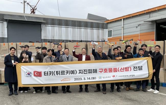 ‘세상을 아름답게’라는 경영 철학으로 46년간 구두를 만들어 온 ‘바이네르’가 지진 피해를 본 튀르키예 지역 이재민들에게 신발을 기부했다고 14일 밝혔다. 이날 바이네르 물류센터 앞에서 열린 신발 전달식에는 김원길 바이네르 대표와 김용우 월드투게더 회장 그리고 양측 임원 및 직원들이 참여한 가운데 진행됐다. 바이네르가 제공한 신발은 현지에 있는 튀-한문화교류협회를 통해 이재민들에게 전달된다. 이번 기부 전달 소식에 튀르키예 대통령실 관계자는 항공 운송비 전액을 지원하며, 고마움을 전했다.