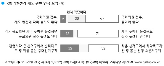 국회의원 수를 현행 300명 보다 더 줄여야 한다는 여론조사 결과가 나왔다. 24일 한국갤럽에 따르면, 3월 넷째 주(21~23일) 전국 만 18세 이상 1001명에게 주요 현안 관련 의견을 물은 결과 ‘국회의원 정수를 줄여야 한다’는 응답이 57%로, 과반을 넘은 것으로 나타났다. 응답자의 30%는 ‘현재 적당하다’고 봤고, 9%만 ‘늘려도 된다’고 답했다. 4%는 의견을 유보했다.