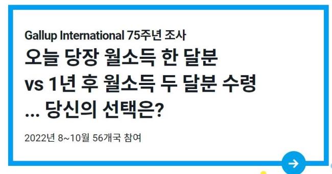 만약 오늘 당장 월평균 소득만큼의 추가적인 돈을 받는 것과 1년 후 월평균 소득 두 배만큼의 돈을 받는 것이 제시된다면 당신은 어떤 선택을 할 것인가. 갤럽 인터내셔널 작년 8~10월 56개국 시민 5만3321명에게 어느 쪽을 선택할 것인지 물었다. 이는 심리학·행동경제학에서 다루는 ‘현재 편향(present bias)’ 경향을 알아보는 질문이다.