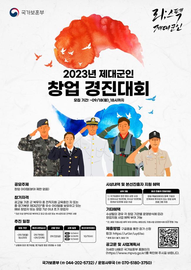 국가보훈부는 제대군인들의 잠재된 창업 의욕을 고취하기 위해 ‘2023년 제대군인 창업 경진대회’를 개최한다고 29일 밝혔다. 공고일 기준 군 복무자 중 전직지원 교육 중인 자이거나 중·장기복무제대군인 중 우수 창업 아이템을 보유하고 있는 예비 창업자 또는 초기 창업자(창업 7년 이내)를 대상으로 진행된다.