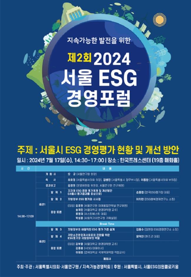 서울연구원은 오는 17일 서울 종로구 한국프레스센터에서 서울특별시의회가 주최하고 지속가능경영학회와 공동주관 하는 제2회 ‘서울 ESG 경영포럼’을 개최한다고 16일 밝혔다.