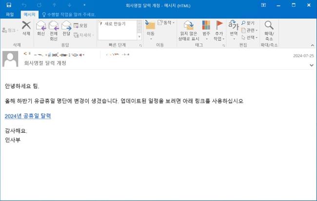 안랩에 따르면, 공격자는 먼저 기업 인사 부서를 사칭해 ‘회사 명절 달력 개정’이라는 제목의 피싱 메일을 유포했다. 본문에는 ‘올해 하반기 유급 휴일 명단에 변경이 생겼으니 아래 링크를 클릭해 업데이트된 일정을 확인하라’는 내용으로 악성 링크 클릭을 유도했다. 링크는 ‘2024년 공휴일 달력’이라는 이름으로 삽입됐다.